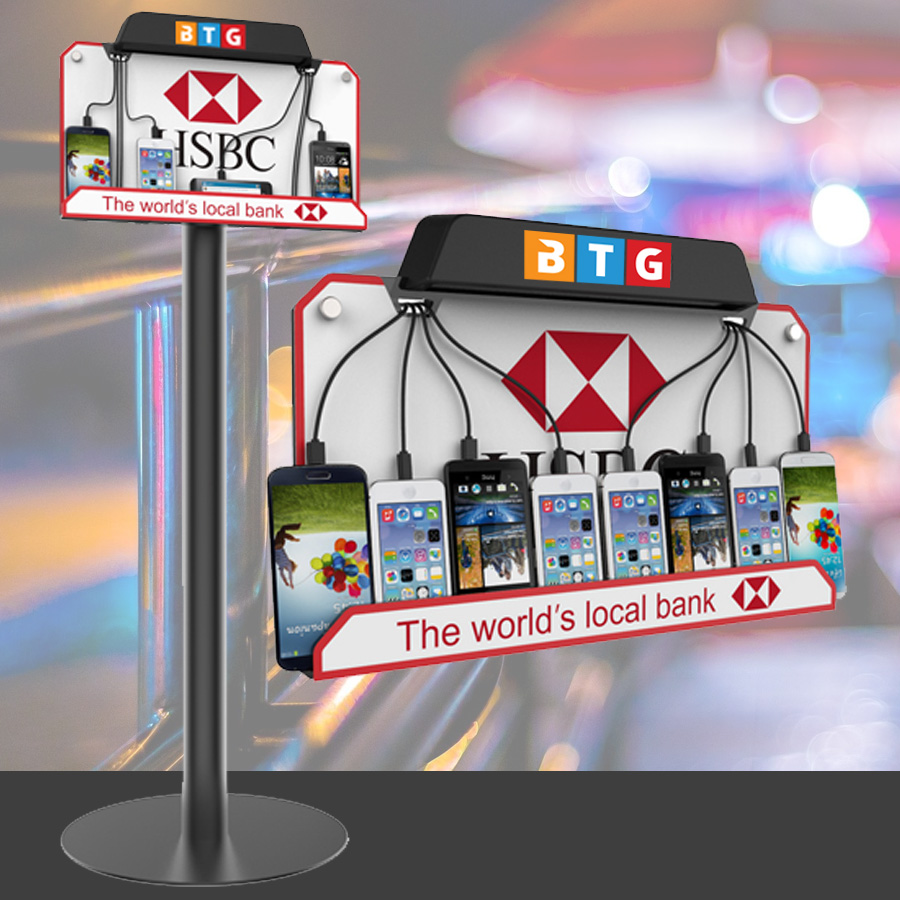 Wall or Pole Charger is a commercial-grade charging station designed to withstand high usage. Catering up to 8 devices at once and covering virtually all phones and tablets on the market. Featuring a fully customisable signage area with LED lighting for advertisements.
